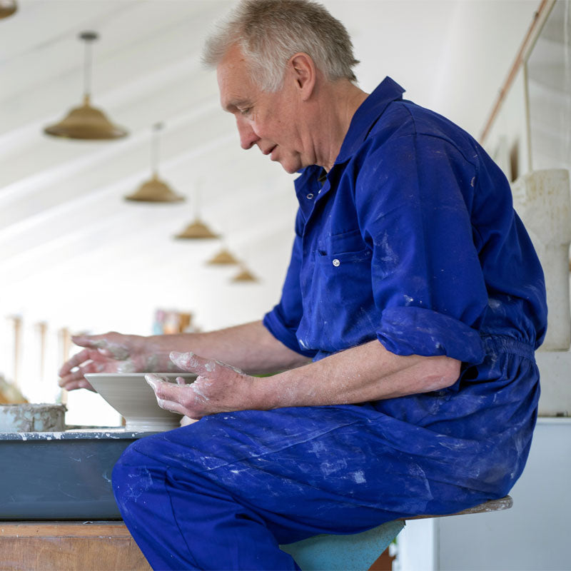 Peter has been throwing pots for over 30 years. He opened his first pottery in Cornwall in the early 1990s and since then he had run successful galleries in Marazion and Bath, selling beautiful British pottery and paintings. He has recently opened a beautiful gallery space at NT Croome where you can browse and buy all of the pieces that we have for sale on this website (plus a few larger items that we can't send through the post!) Peter has made and sold many pieces over the last three decades and you can often find them coming around for a second time at auction. After meeting and working with Sarah, Peter does not produce so much of his own work these days and is primarily focused on creating pots for Sarah to paint, along with his own experimental creations, so finding work for sale with his name on has become less common.