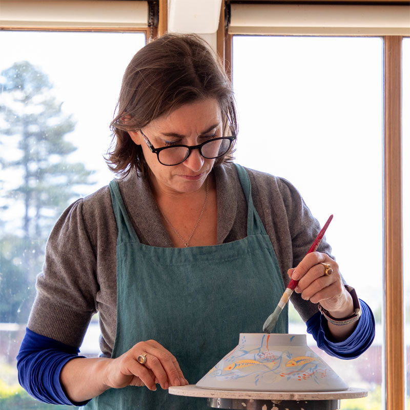 Before taking up her potter’s paintbrush, Sarah worked exclusively with textiles. She gained her first degree, BA (Hons) in Surface Pattern at SCAT in Somerset in 1996 and an MA in textiles from Bath University in 2008. She began developing her well-known range of cushions and wall hangings, inspired by a 2 day train journey from LA to Seattle. As the trees, barns and houses flashed past the windows she sketched them and used the quickly noted shapes to develop a new range of folk-art inspired designs of pillows, herb houses and doorstops. During this time she met her partner, potter Peter O’Neil. As she watched him working in his studio one day she asked if she could have a go at painting a pot or two, and the rest is history! Their relationship flourished and so did their creativity. Shortly afterwards, Earls Croome Pottery was born.